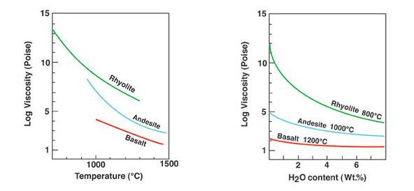 Les magmas basaltiques comprennent entre 45 et 52 % de silice. Les magmas granitiques ont plus de 63 % de silice, ce qui les rend plus visqueux que les magmas basaltiques. Il est impossible de faire couler un magma granitique sans le chauffer à des températures très supérieures à son point de fusion à pression ambiante. Certains volcans émettent des laves « acides » (riches en silice), mais elles ne s’écoulent pas. Elles forment par exemple des dômes. Comme ces magmas sont chargés en gaz, leurs émissions sont souvent précédées d’explosions. Ainsi, après avoir dévasté la ville de Saint-Pierre le 8 mai 1902, la montagne Pelée a émis une aiguille de dacite. Elle a été observée en mars 1903 et s’élevait jusqu’à 1 566 mètres d’altitude. Elle s’est éboulée par la suite.