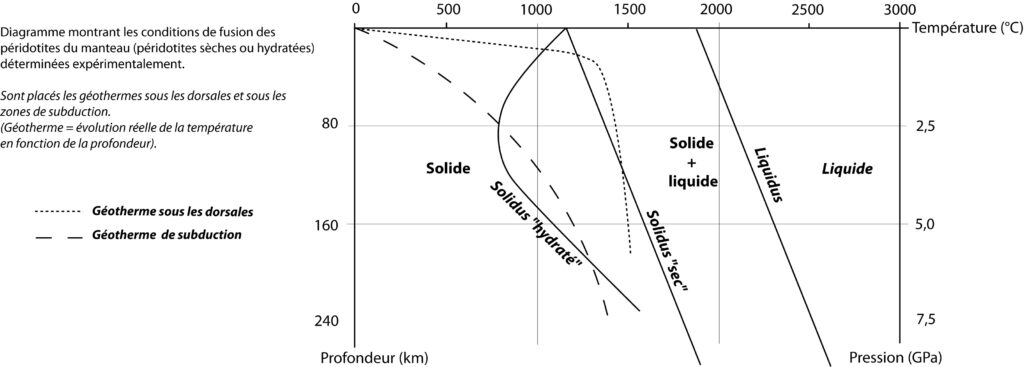 À pression ambiante, la roche commence à fondre vers 1200 °C. Elle devient totalement liquide vers 1800 °C. Ces températures augmentent avec la pression et donc avec la profondeur. Cependant, la présence d’eau abaisse le solidus, surtout vers des pressions de 2,5 GPa, qui correspondent à des profondeurs d’environ 80 km. Autrement dit, l’eau aide la péridotite à fondre. Ce solidus est dit « hydraté ».