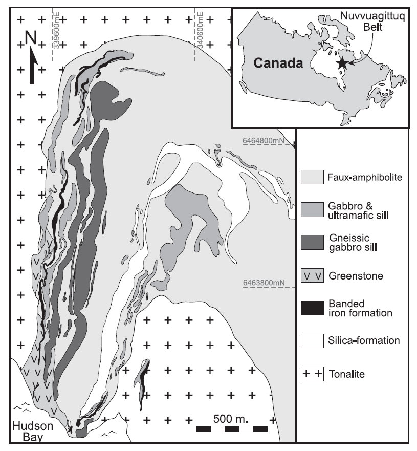 Pour effectuer leurs recherches, P. Boehnke et ses collègues ont pris des échantillons de la ceinture de roches vertes de Nuvvuagittuq au nord du Québec, sur la côte est de la baie d’Hudson. C’est un affleurement de 8 km². La principale roche est l’amphibolite de Faux. Elle est métamorphique, c’est-à-dire qu’elle résulte de la transformation par la chaleur et la pression d’une roche antérieure (un protolithe). Ce pourrait être des cendres volcaniques à caractère basaltique. Comme elle ne contient pas de zircon, Jonathan O’Neil de l’Université McGill à Montréal a utilisé en 2008 un autre moyen de datation. Il repose sur le samarium 146, un élément du groupe des terres rares qui se désintègre par radioactivité en néodyme 142 avec une demi-vie de 103 millions d’années. Cela veut dire qu’après ce laps de temps, la quantité de samarium 146 est divisée par deux. Cette méthode a donné un âge de 4,28 milliards d’années à l’amphibolite de Faux. Le record d’ancienneté obtenu a fait sensation. En 2012, la demi-vie du samarium 146 a été révisée à 68 millions d’années, si bien que l’âge de l’amphibolite a été augmenté à 4,36 milliards d’années. Cependant, les âges d’autres roches comportant des cristaux de zircons ne dépassent pas 3,82 milliards d’années. Plus encore, en étudiant la désintégration du samarium 147 en néodyme 143, qui s’effectue avec une demi-vie de 106 milliards d’années, on obtient un âge de 3,82 milliards d’années pour l’amphibolite, en accord avec celui des zircons.