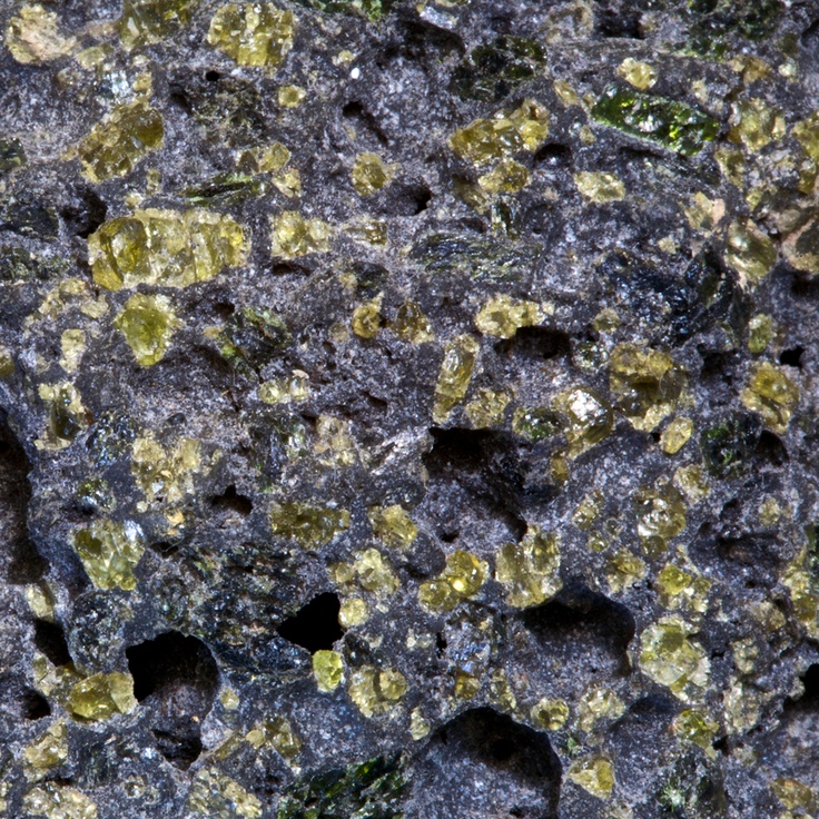 Le basalte est la plus répandue de toutes les roches volcaniques. Elle est constituée d’une « pâte » noire dans laquelle des phénocristaux (cristaux visibles à l’œil nu) sont parfois présents. Ceux-ci sont des feldspaths plagioclases blancs et des pyroxènes noirs à vert sombre, ainsi que des olivines vert-jaune. Cette pâte, ou mésostase, comprend des cristaux microscopiques et du verre. On y retrouve les mêmes minéraux que ceux déjà cités, ainsi que des oxydes de fer et de titane. Dans un verre, les atomes ne sont pas ordonnés comme dans un cristal. Il s’agit en fait d’un liquide qui a été brusquement refroidi et figé.