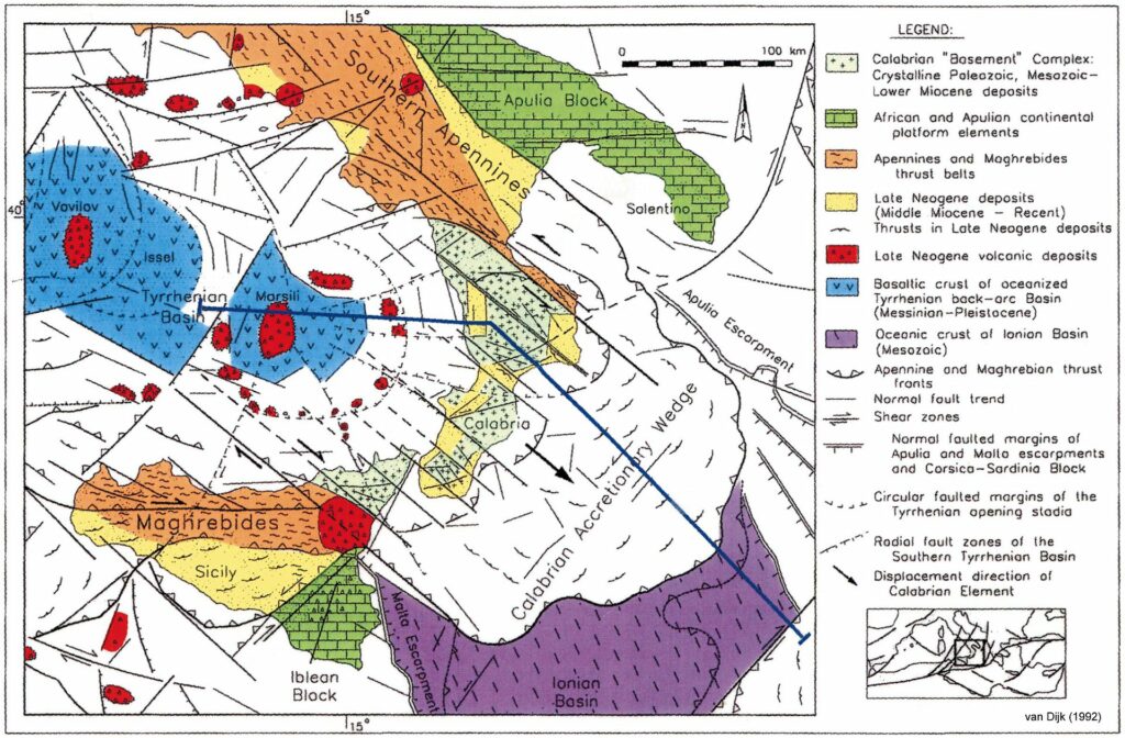 L’Etna est un volcan proche de la France, sur lequel il existe une bonne documentation. Pourtant, il n’est pas simple d’expliquer pourquoi il existe. La carte géologique de van Dijk montre comment la région est constituée. On y voit une ligne ponctuée de triangles, qui vient de l’ouest, monte vers l’Etna (en rouge à l’est de la Sicile), puis redescend. Elle continue ensuite vers l’est puis s’infléchit vers le nord-ouest pour passer entre la Calabre et les Pouilles (ou Apulie). Cette ligne indique une zone de subduction, là où une plaque lithosphérique s’enfonce sous une autre.