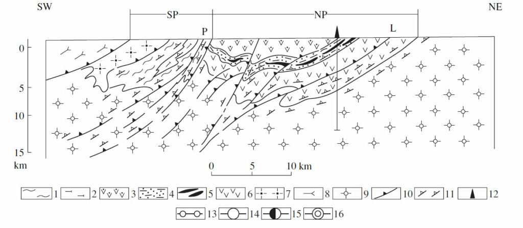 En 2001, les géologues ont démontré que les roches archéennes trouvées à plus de 6 842 mètres existent également en surface, au nord-est du site. Je mets la coupe géologique qu’ils ont déterminée. Les lettres SP et NP désignent respectivement les parties sud et nord du groupe de Pechenga. Le puits de forage (numéro 12) se trouve dans sa partie nord. On voit qu’il traverse des couches géologiques inclinées vers le sud-ouest. La grande ligne crénelée L représente la faille de Luchlompolo. Des intrusions de laves basiques (comme les basaltes) et ultrabasiques porteuses de nickel ont été indiquées en noir avec le numéro 5. Le forage les a rencontrées. Les roches archéennes portent le numéro 9.