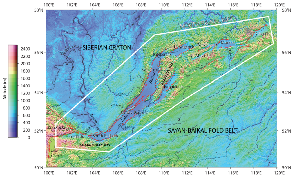 Il n’y a pas de volcan actif autour du rift, mais il y en a eu. Ils ont laissé des laves basaltiques qui ne sont pas indiquées sur cette carte. Elles se trouvent du côté de Tunga b. et à l’est de Barguzin b., si bien que leur disposition est dissymétrique. C’est souvent ainsi que les rifts sont faits. Les failles étant toujours actives, le lac Baïkal est une zone sismique. Le dernier tremblement de terre dont j’ai connaissance a eu lieu le 18 janvier 2015. Il était de magnitude de 5 et s’est produit au nord-ouest du lac.