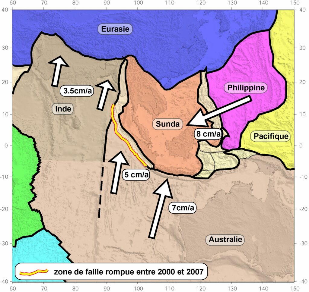 La carte montre la situation. On voit plusieurs plaques, celle de l’Eurasie, celle de l’Inde et de l’Australie, celle de la Sonde où se trouve une grande partie de l’Indonésie, la Malaisie et toute la péninsule indochinoise – c’est un promontoire de l’Eurasie. Le bloc de la Sonde est purement continental, mais il est partiellement recouvert par la mer. Les vitesses de déplacement des plaques sont indiquées en centimètres par an. On remarque deux failles parallèles le long de l’île de Sumatra. Celle qui se trouve à l’ouest de l’île est causée par la subduction de la plaque indo-australienne sous le bloc de la Sonde. Ce phénomène a provoqué le séisme du 26 décembre 2004. L’autre faille traverse l’île de Sumatra. La « lanière » entre les deux failles glisse vers le nord-ouest. C’est ce mouvement qui a causé l’éruption.