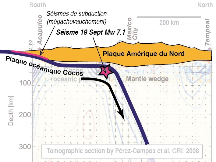 Puisque la plaque s’enfonce dans le manteau terrestre, des séismes se produisent à l’interface entre la plaque et le manteau, le glissement s’effectuant par à-coups. C’est la cause du séisme du 19 septembre 1985. Ce phénomène est qualifié de mégachevauchement, car il est semblable aux chevauchements qui se produisent dans la croûte continentale, quand elle est comprimée : une faille oblique apparaît et un bloc grimpe sur l’autre. Mais les séismes peuvent aussi être dus à des contraintes qui s’exercent à l’intérieur de la plaque. Comme la plaque est tirée vers le bas, elle s’étire et se casse. C’est ce qui s’est produit le 8 septembre, à un peu plus de 60 km de la fosse, puis le 19 septembre à l’endroit où la plaque replonge dans le manteau. Vu sa position, le second séisme pourrait également être dû à la flexion de la plaque.