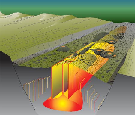 Mais quelles températures y a-t-il dans le manteau ? Une courbe qui donne la température en fonction de la profondeur s’appelle un géotherme. Trois d’entre elles ont été représentées sur le diagramme. Sous les continents anciens, la température augmente assez lentement avec la profondeur. À 80 km, elle est d’environ 900 °C. Sous les continents récents, l’augmentation est plus rapide. À la même profondeur, elle est d’environ 1 300 °C. Pourtant, dans ces deux cas, le solidus sec n’est pas atteint. La température où la roche commence à fondre est d’environ 1 500 °C. C’est pourquoi le manteau est solide. En revanche, la fusion est possible sous les rides, aussi appelées dorsales océaniques. C’est indiqué par la flèche 1. À ces endroits, où les plaques lithosphériques s’écartent les unes des autres, c’est la décompression qui joue : les roches du manteau sont entraînées vers la surface, pour combler l’espace entre les plaques, et subissent donc une fusion partielle. De fait, les 60 000 km de dorsales sont les plus importantes zones volcaniques de la Terre, mais comme elles sont sous les océans, elles sont difficiles à observer. L’illustration montre la dorsale médio-atlantique. Il y a une chambre magmatique dans le manteau. Le magma monte par des failles qui résultent de l’écartement des plaques. La majeure partie se solidifie avant d’atteindre le plancher de l’océan. Un peu de magma atteint le plancher, où il entre en contact avec l’eau et refroidit très vite. La fusion partielle d’une péridotite donne une roche de composition différente : elle est basaltique.