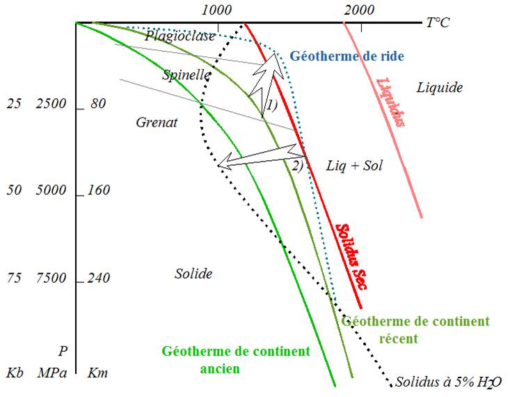Jusqu’à présent, les péridotites étaient supposées dépourvues d’eau, ce qui est presque toujours le cas. C’est pourquoi on a parlé de solidus sec. Or à pression égale, une péridotite hydratée fond à une température inférieure. Le diagramme donne en pointillé le solidus à 5 % d’eau. La température de fusion des roches peut être abaissée de presque 700 °C. L’hydratation du manteau se produit notamment dans les zones de subduction. Les plaques océaniques s’enfoncent dans le manteau et perdent l’eau qu’elles ont accumulée. C’est cela qui provoque le volcanisme de subduction.